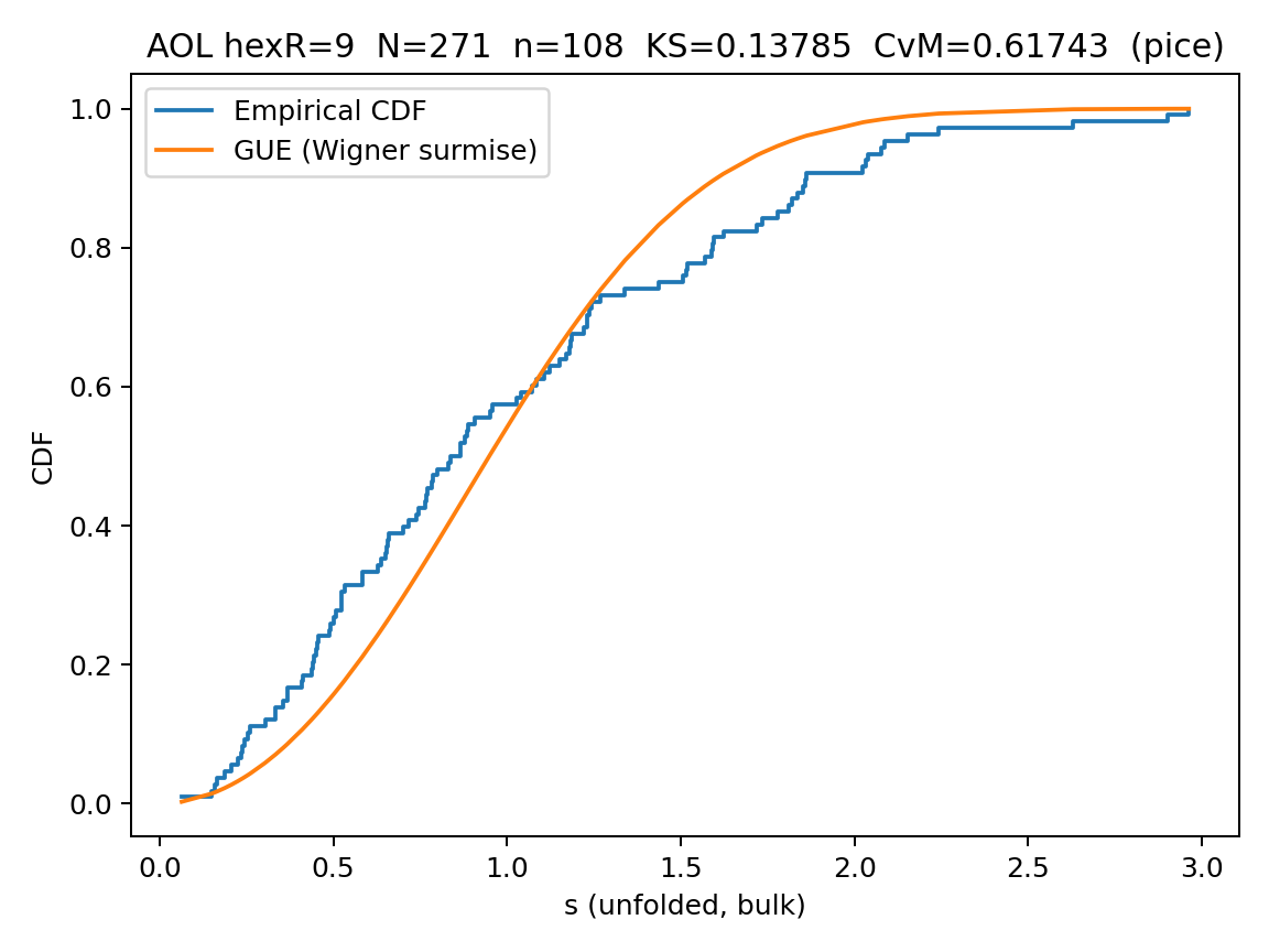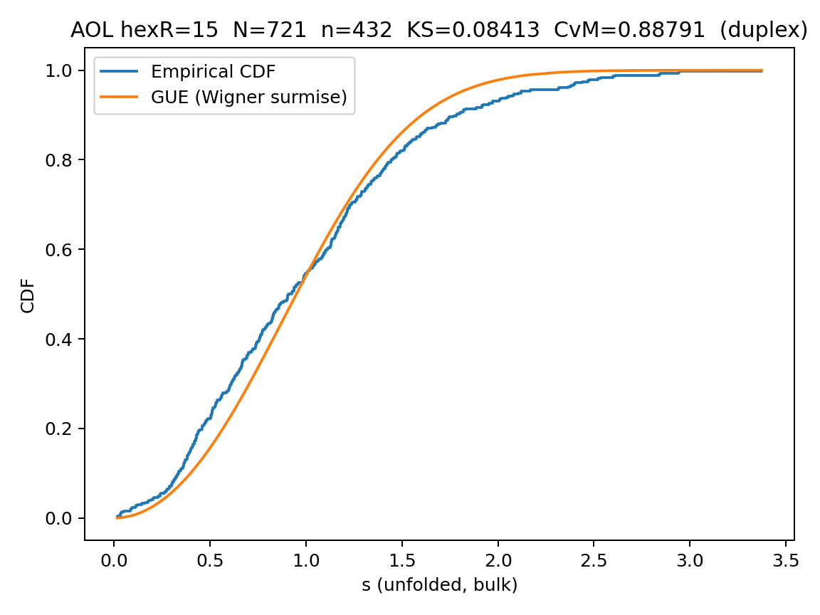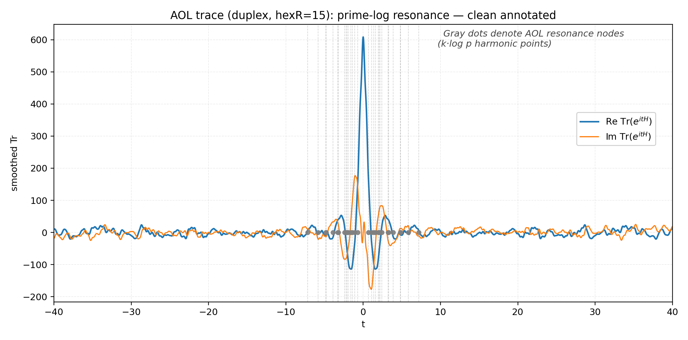 AOL acts on the hex-lattice disk of radius R with spiral index map f. Diagonal terms use von Mangoldt anchors, off-diagonals are nearest-neighbor hops with duplex phases \(\theta_{v,w}=2\pi\alpha(\Phi(f(v))+\Phi(f(w)))\) where \(\Phi=\Lambda\) and \(\alpha=1/\varphi\). Bulk eigenvalue spacings are unfolded (quantiles shown), normalized to mean 1, and tested against GUE (Wigner surmise). The trace \(\mathrm{Tr}(e^{itH})\) is evaluated on \([-40,40]\) and lightly smoothed; vertical guides and gray dots mark \(k\log p\) harmonics.
