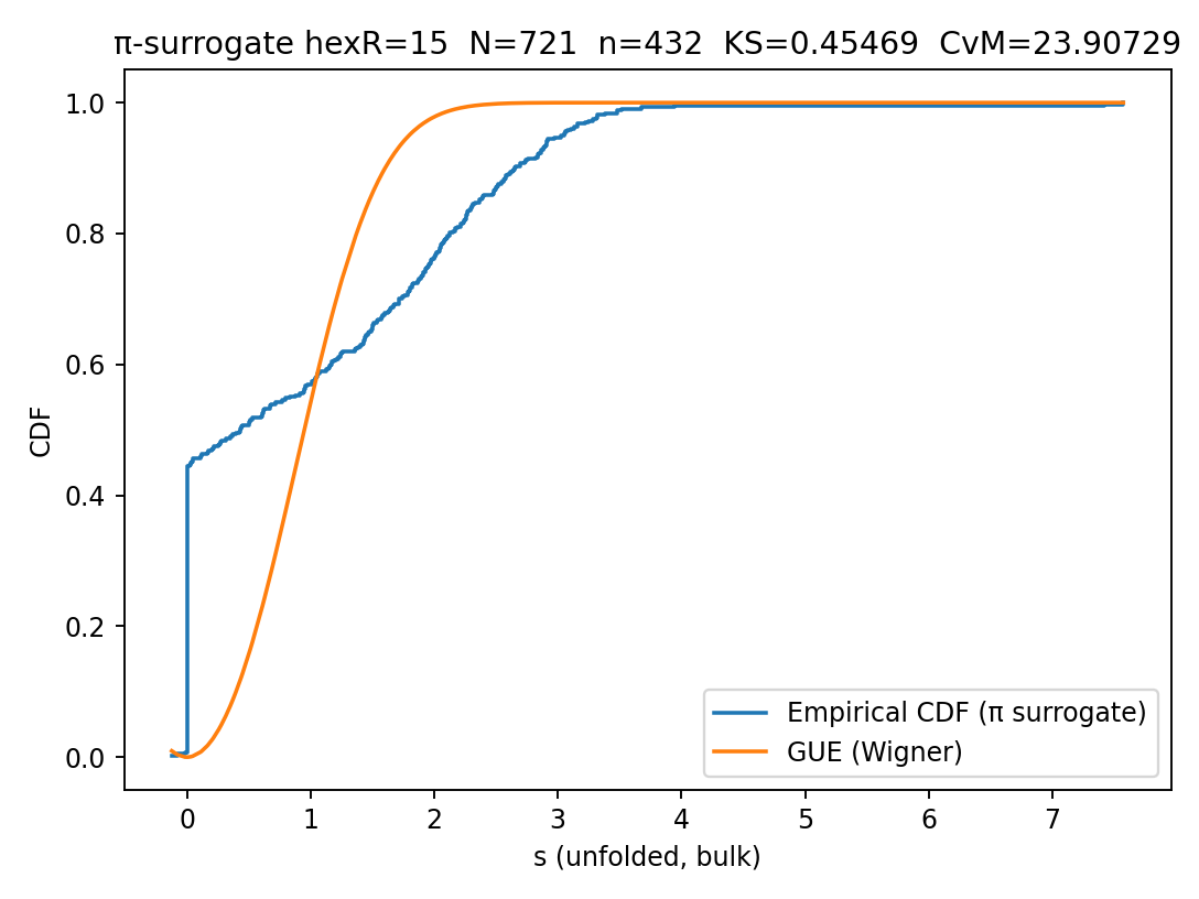| R15 — π surrogate | V(v)=π | 15 | 0.20–0.80 | 0.455 | 23.907 | No GUE; coherence lost (falsification control) |